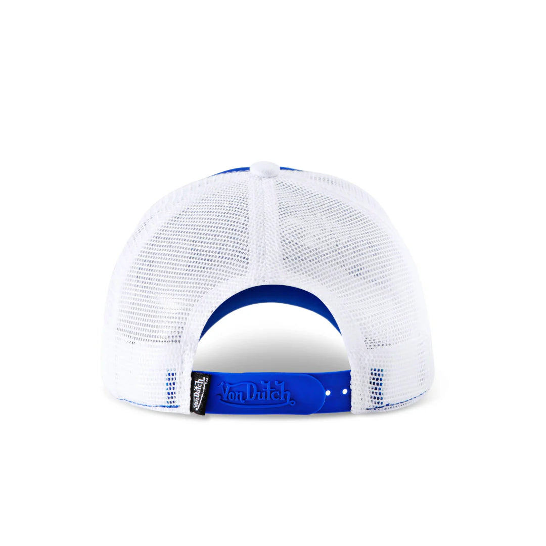 A classic snapback trucker hat by Von Dutch with the classic logo on front in red and white , white breathable mesh rear, and an adjustable snapback panel.