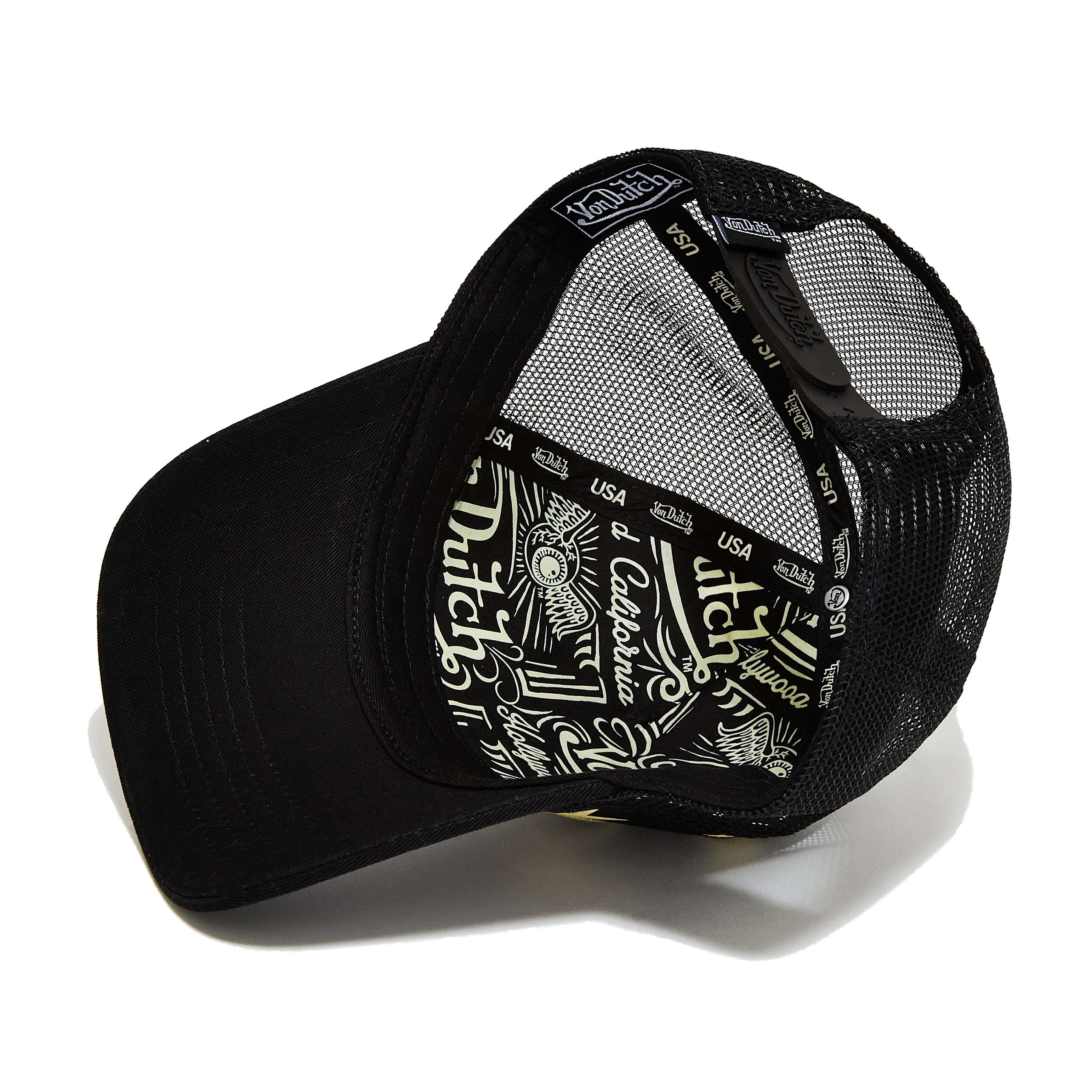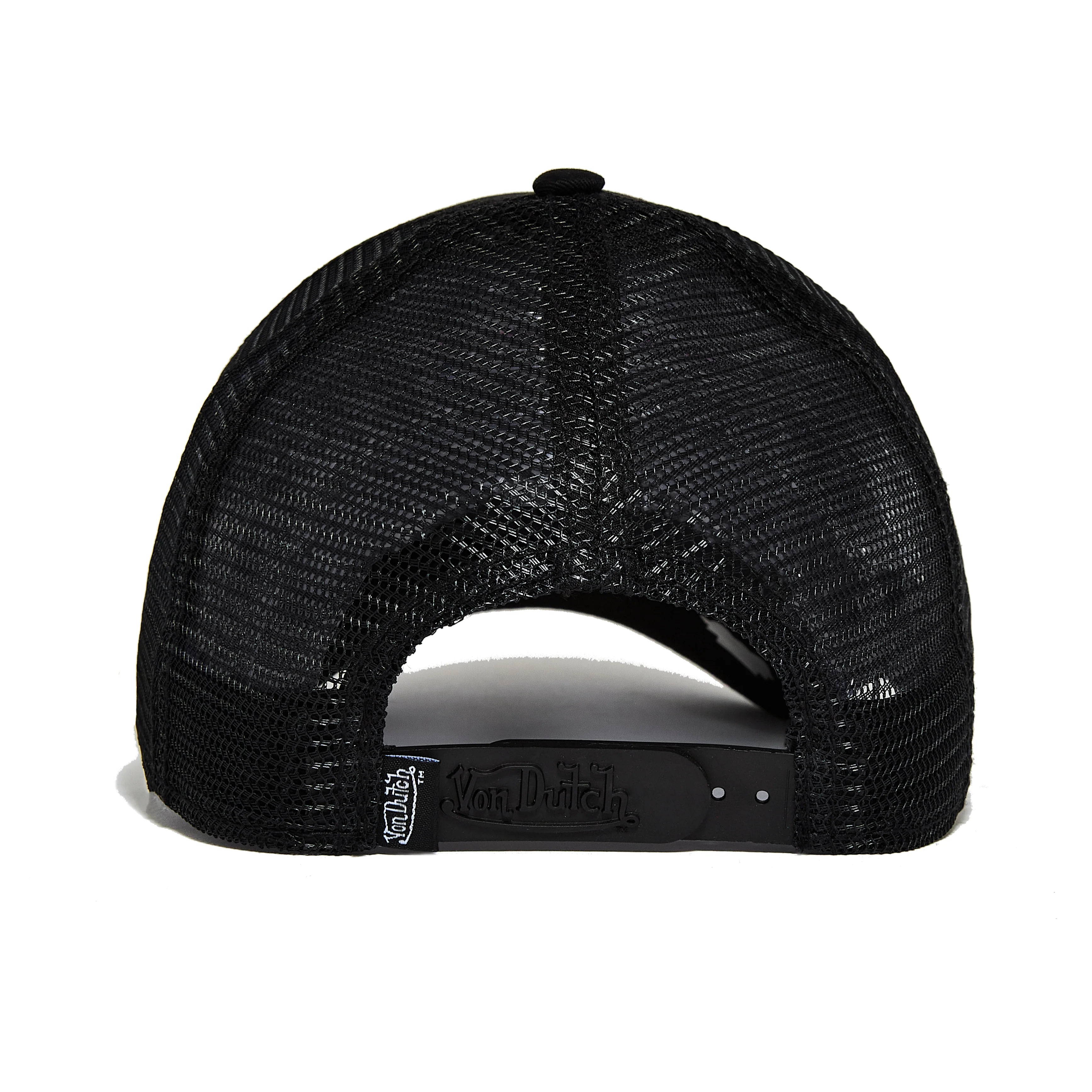 A classic snapback trucker hat by Von Dutch with stars on front, White breathable mesh rear, and an adjustable snapback panel.
