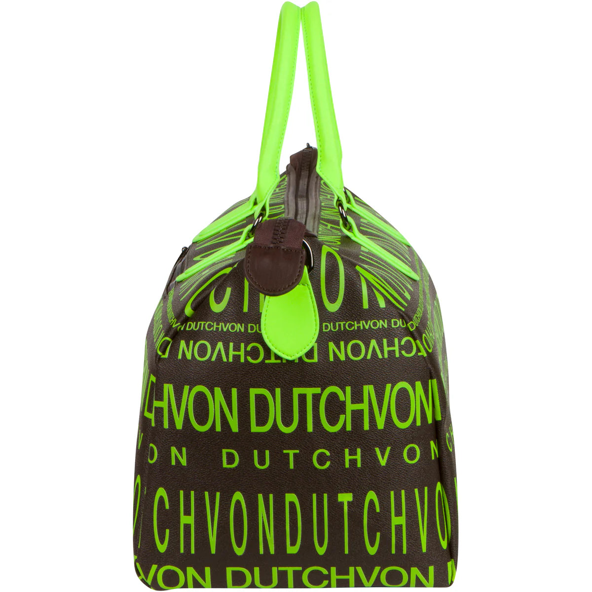 Introducing the Von Dutch “Espresso Lime Monogram” Weekend Duffle — a vibrant blend of edgy style and practical design. Crafted from soft, vegan leather in rich espresso, it showcases a bold lime-yellow monogram pattern that commands attention. Ideal for weekend getaways, gym sessions, or travel, this duffle combines eye-catching looks with thoughtful functionality.