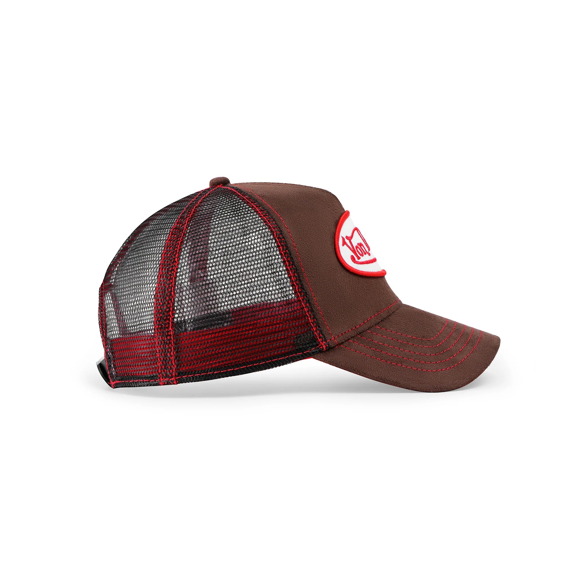 This Classic Snapback Trucker Hat by Von Dutch features brown velvet with the iconic logo patch in Red and White on front, Red stitching, breathable mesh rear, and an adjustable snapback panel. All headwear sales are final.