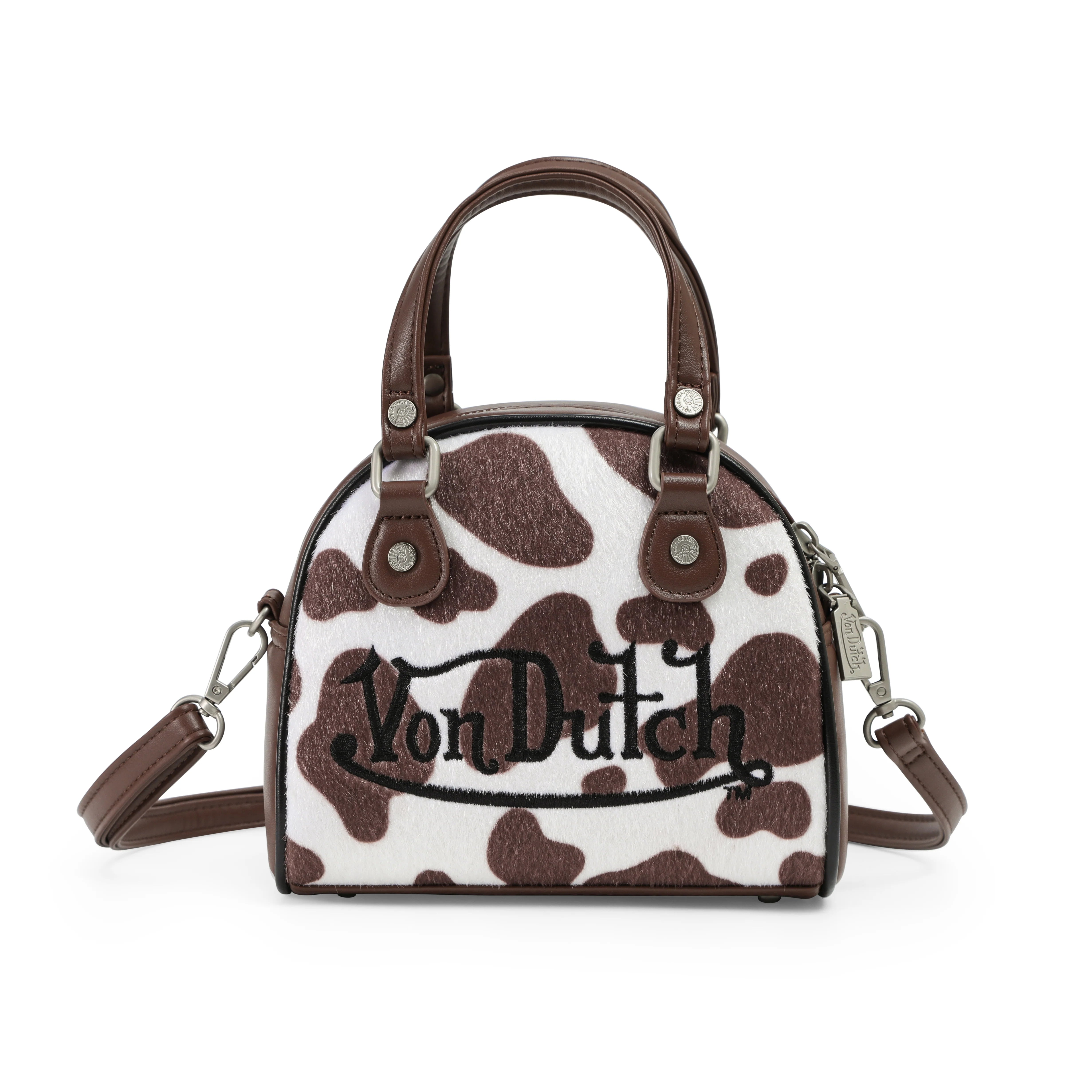 Make a bold entrance with this vibrant Brown and white cow-print bowling bag from Von Dutch—a statement accessory that blends playful flair with everyday functionality.