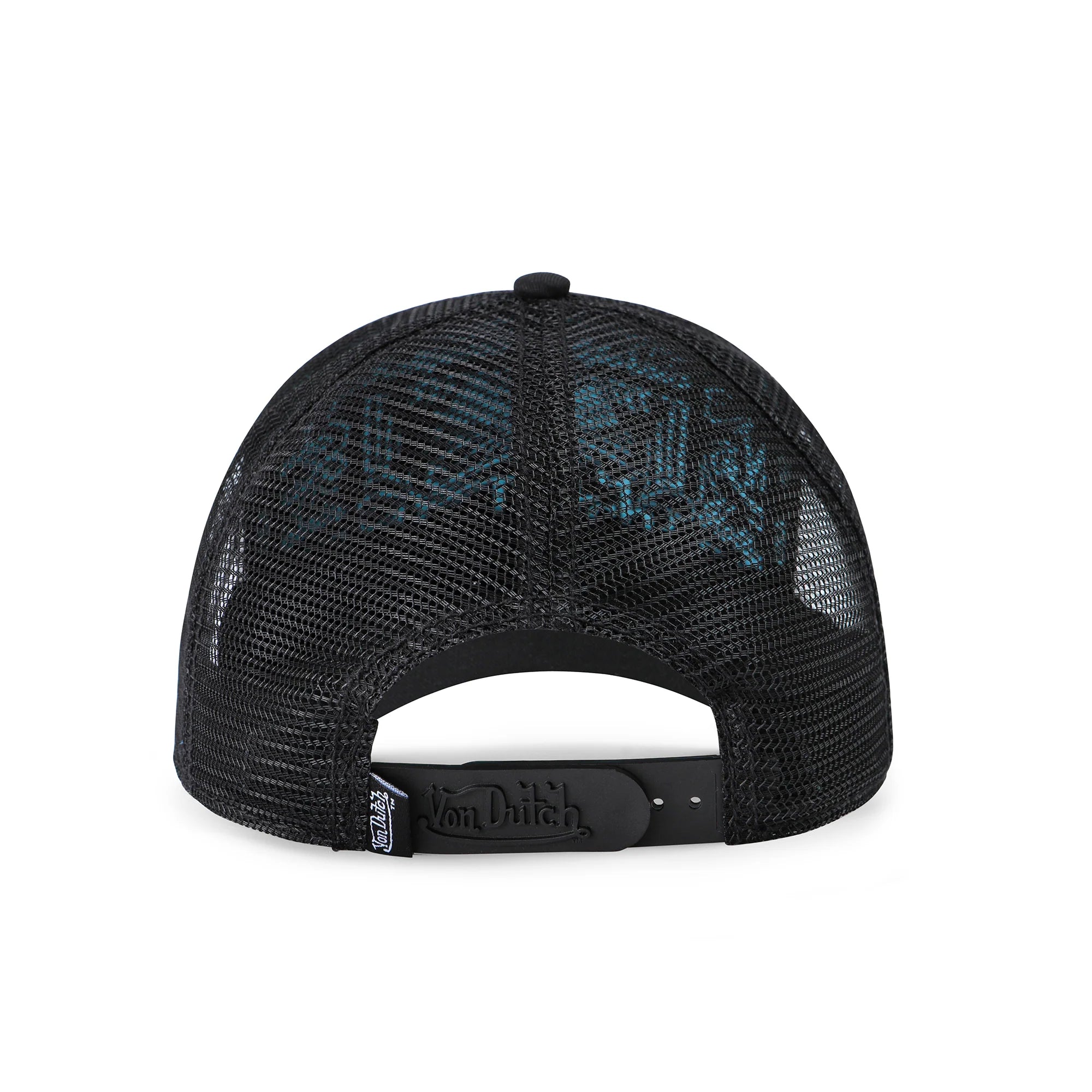 Hot Von Dutch City of Angels Trucker. This Classic snapback trucker hat with flame graphic pattern in silver blue pearl and embroidered White Von Dutch logo on front, black breathable mesh rear, and an adjustable snapback panel. All headwear sales are final.