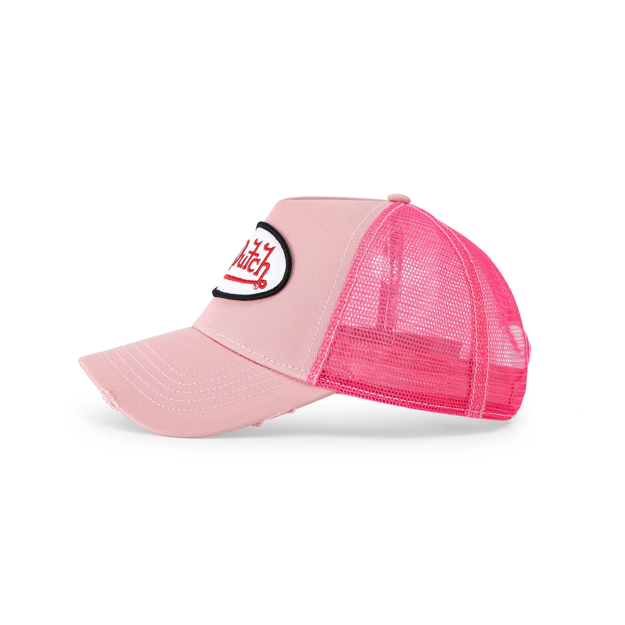 Classic Snapback Trucker Hat by Von Dutch in dirty pink with a distressed edge. Features the iconic logo patch on front, hot pink breathable mesh rear, and an adjustable snapback panel. All headwear sales are final.
