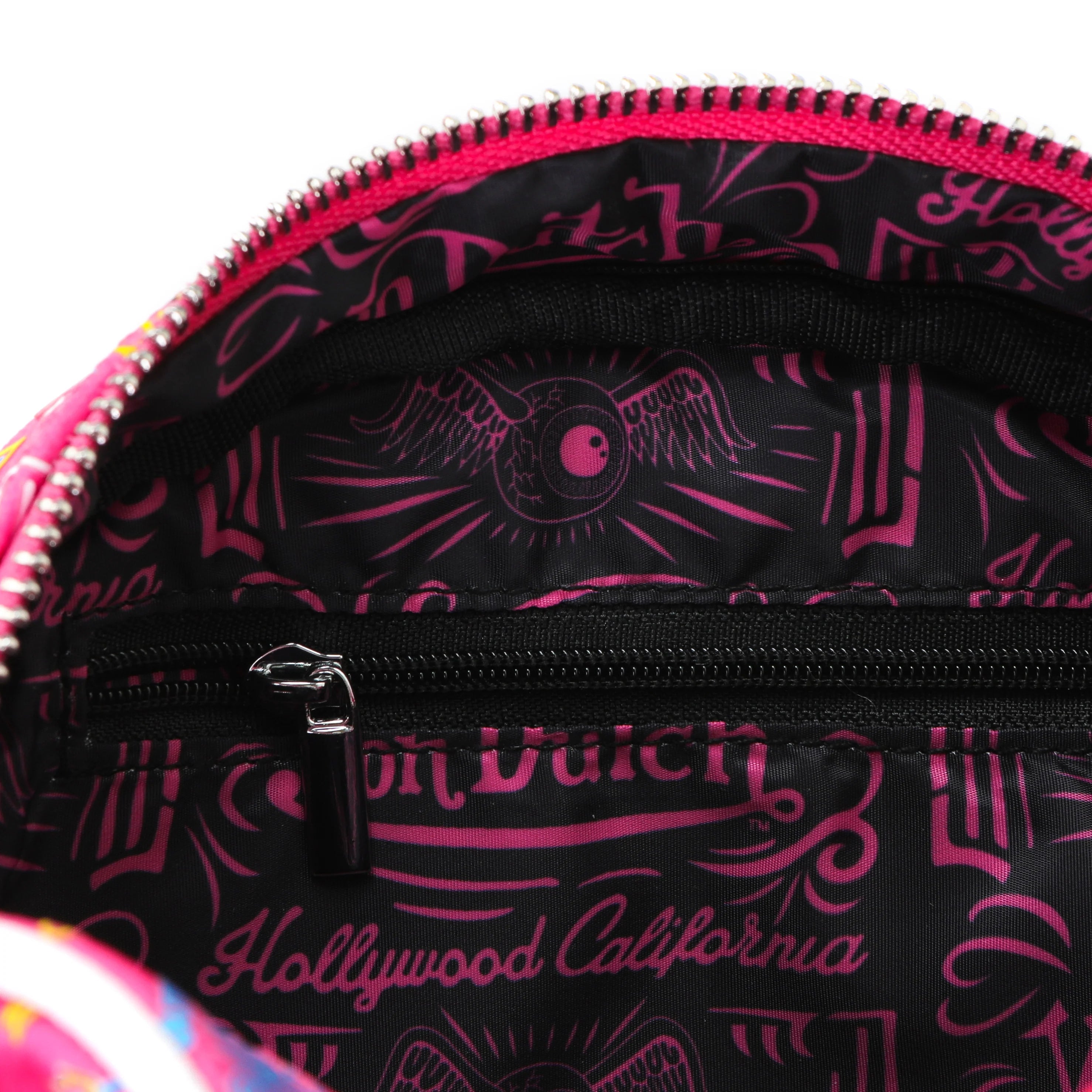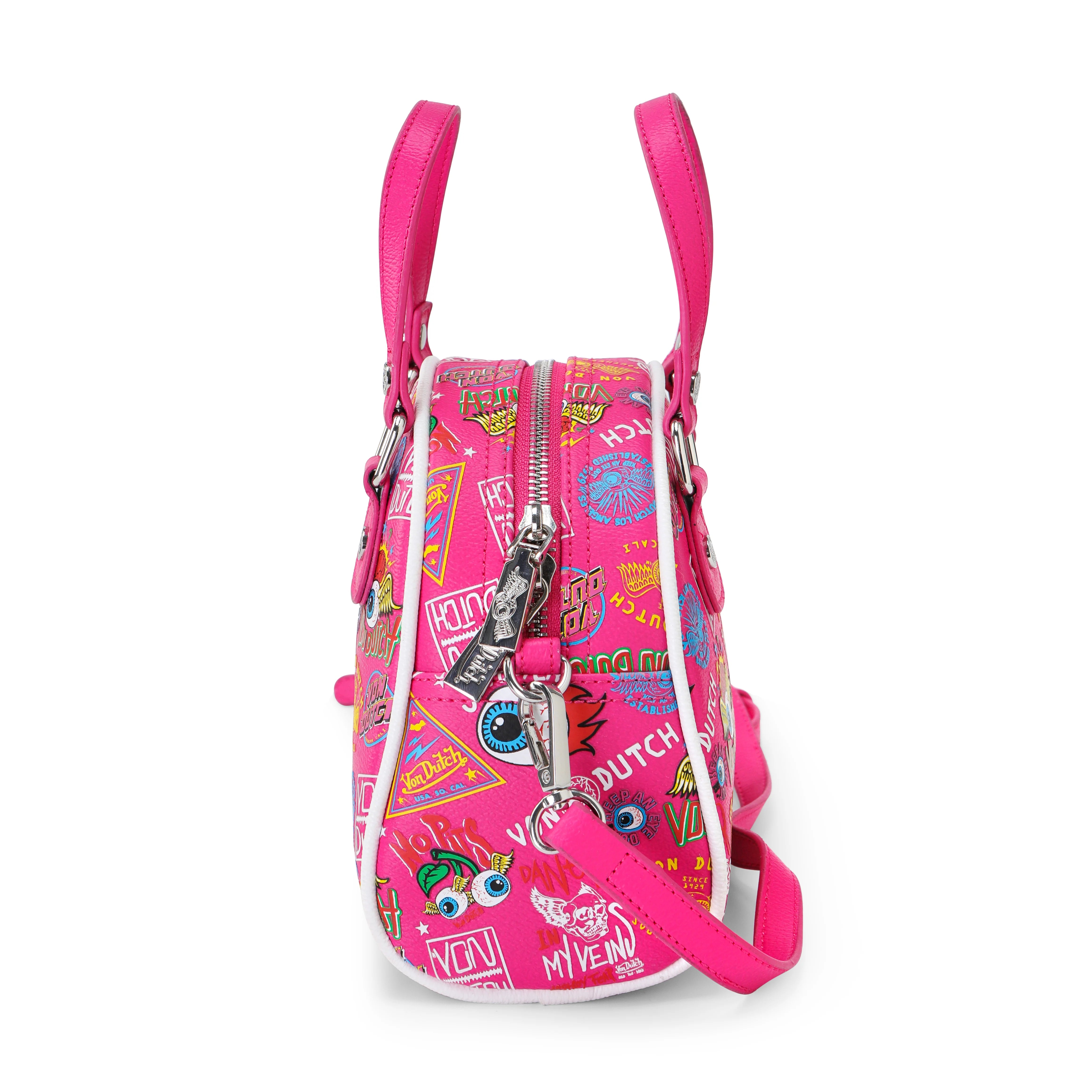 Make a playful statement with the Von Dutch Jax Bowling Bag. Featuring a vibrant all-over hot pink "Jax" graphic print, this limited-edition accessory brings retro personality and modern versatility to your everyday style. Crafted from soft vegan leather with crisp contrast piping and signature monogrammed hardware, it’s perfect for adding bold flair to casual looks or night-out ensembles.