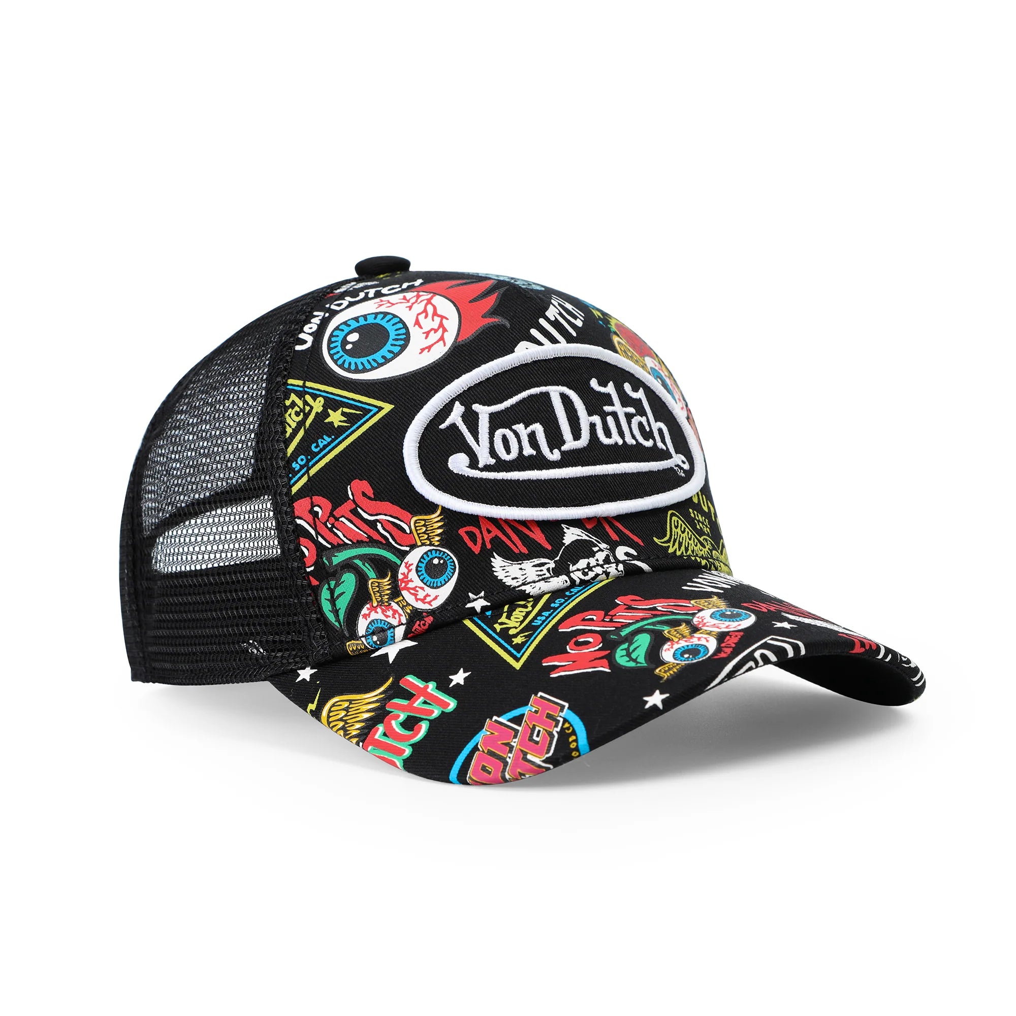 This Classic Snapback Trucker Hat by Von Dutch features an over black jax print with iconic logo patch on front, breathable mesh rear, and an adjustable snapback panel. All headwear sales are final.