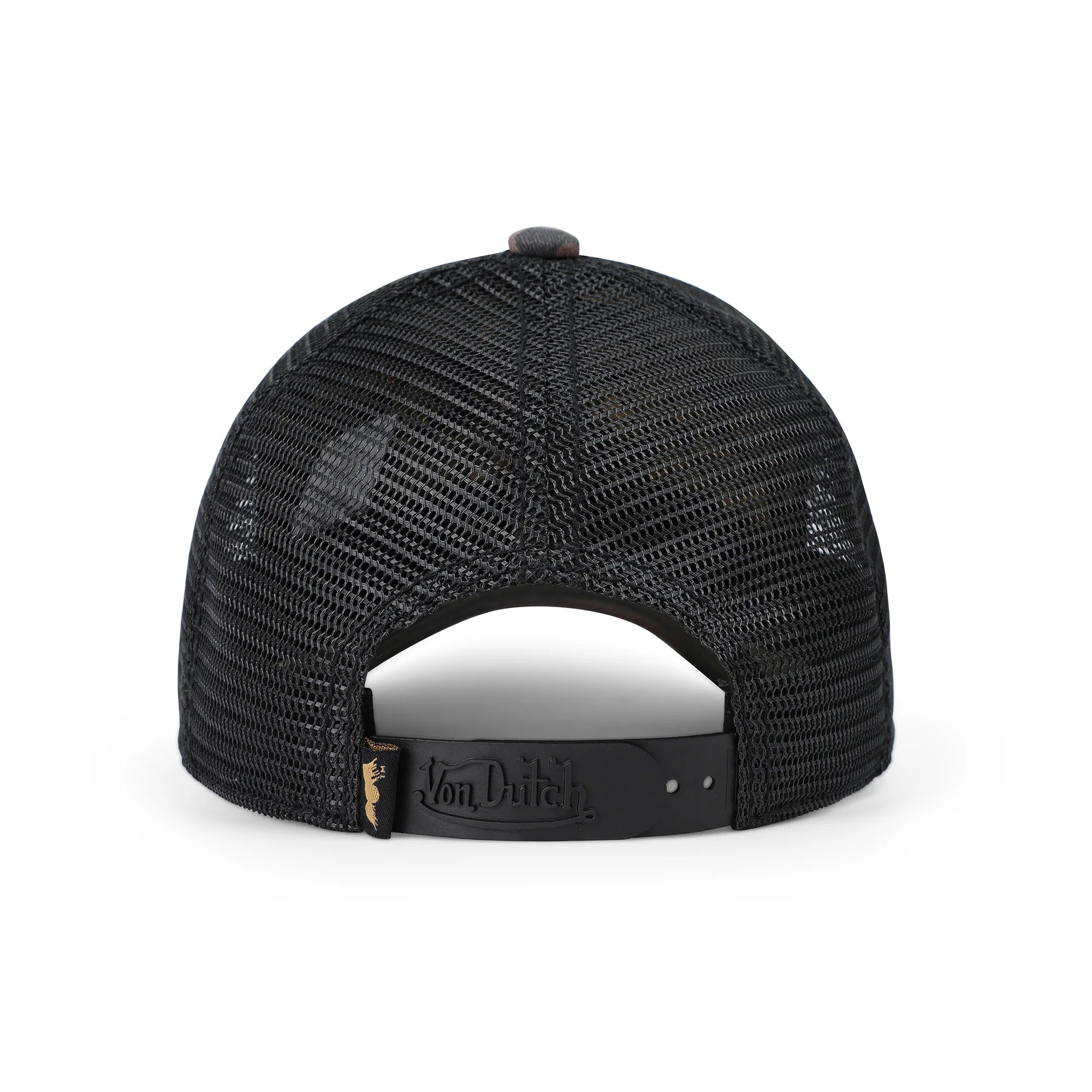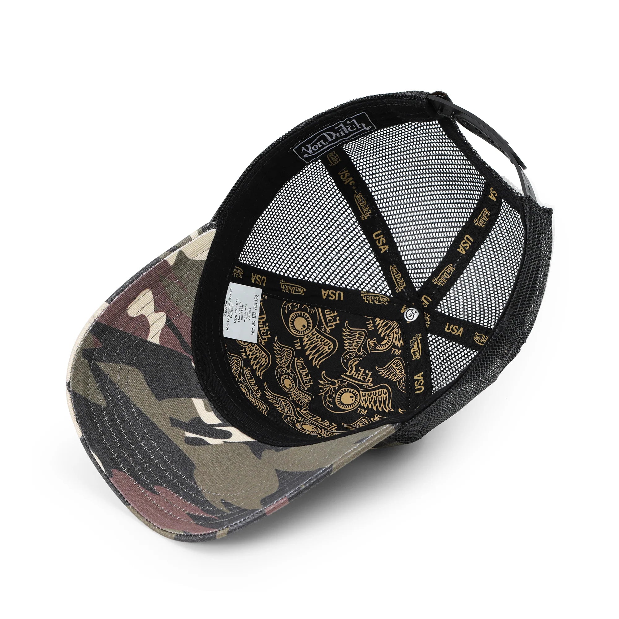 This Classic Snapback Trucker Hat by Von Dutch features a camo canvas front panel with the iconic logo patch on front, black breathable mesh rear, and an adjustable snapback panel. All headwear sales are final.
