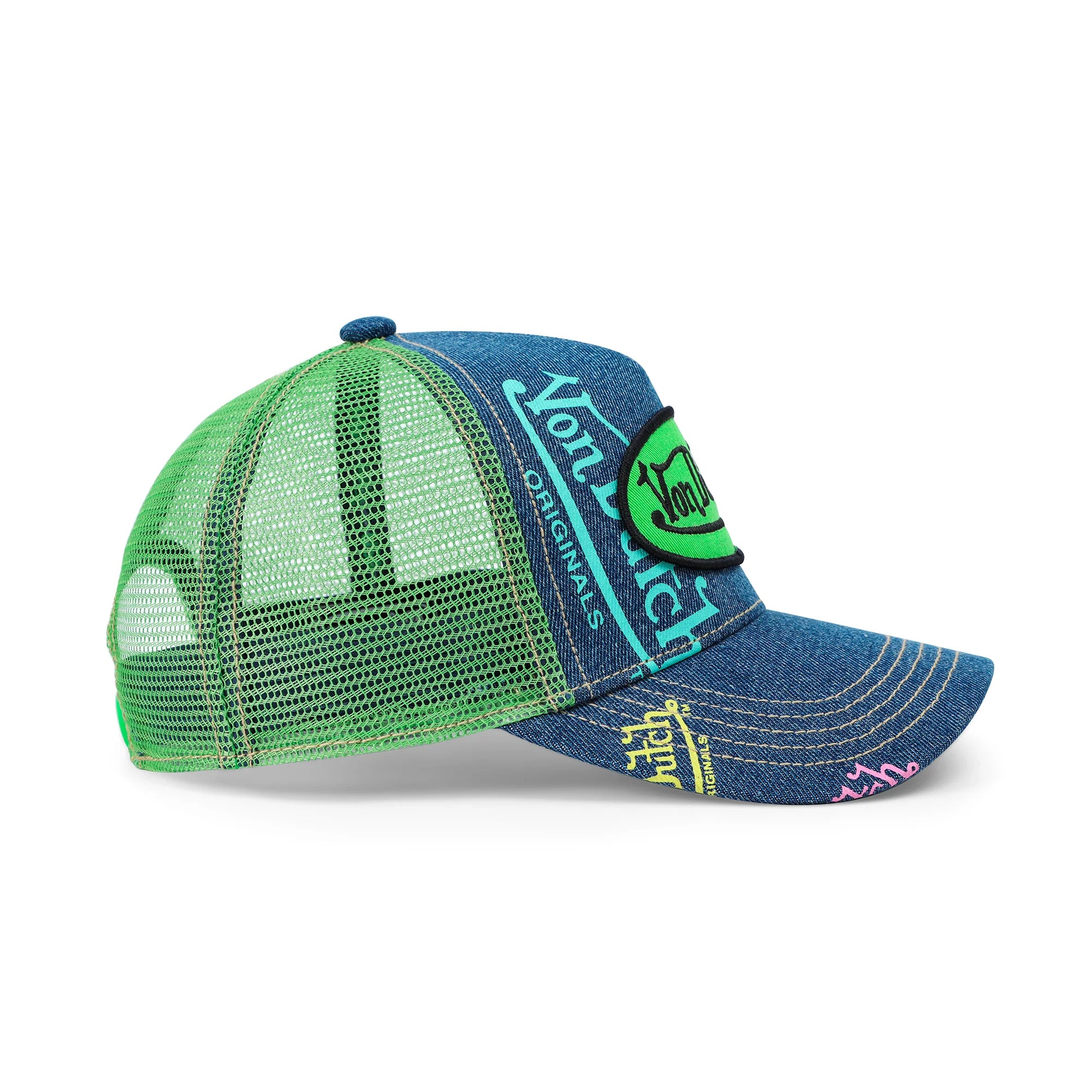 This Classic Snapback Trucker Hat by Von Dutch features a Denim Front panel with the iconic logo patch on front, green breathable mesh rear, and an adjustable snapback panel. All headwear sales are final.