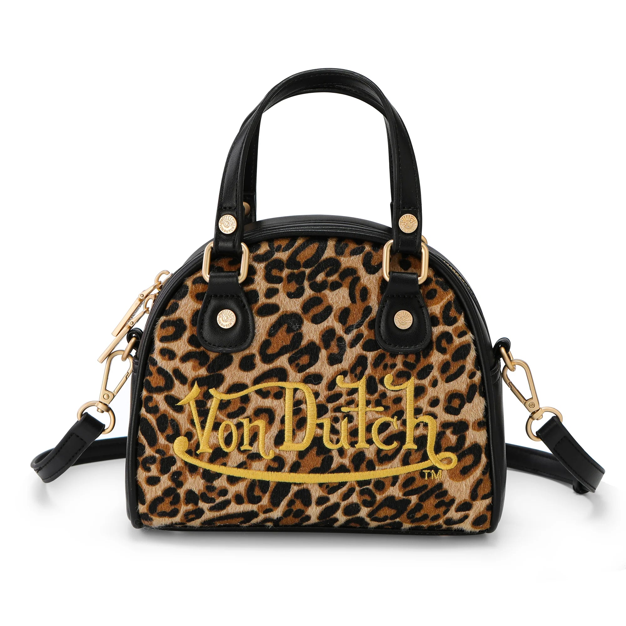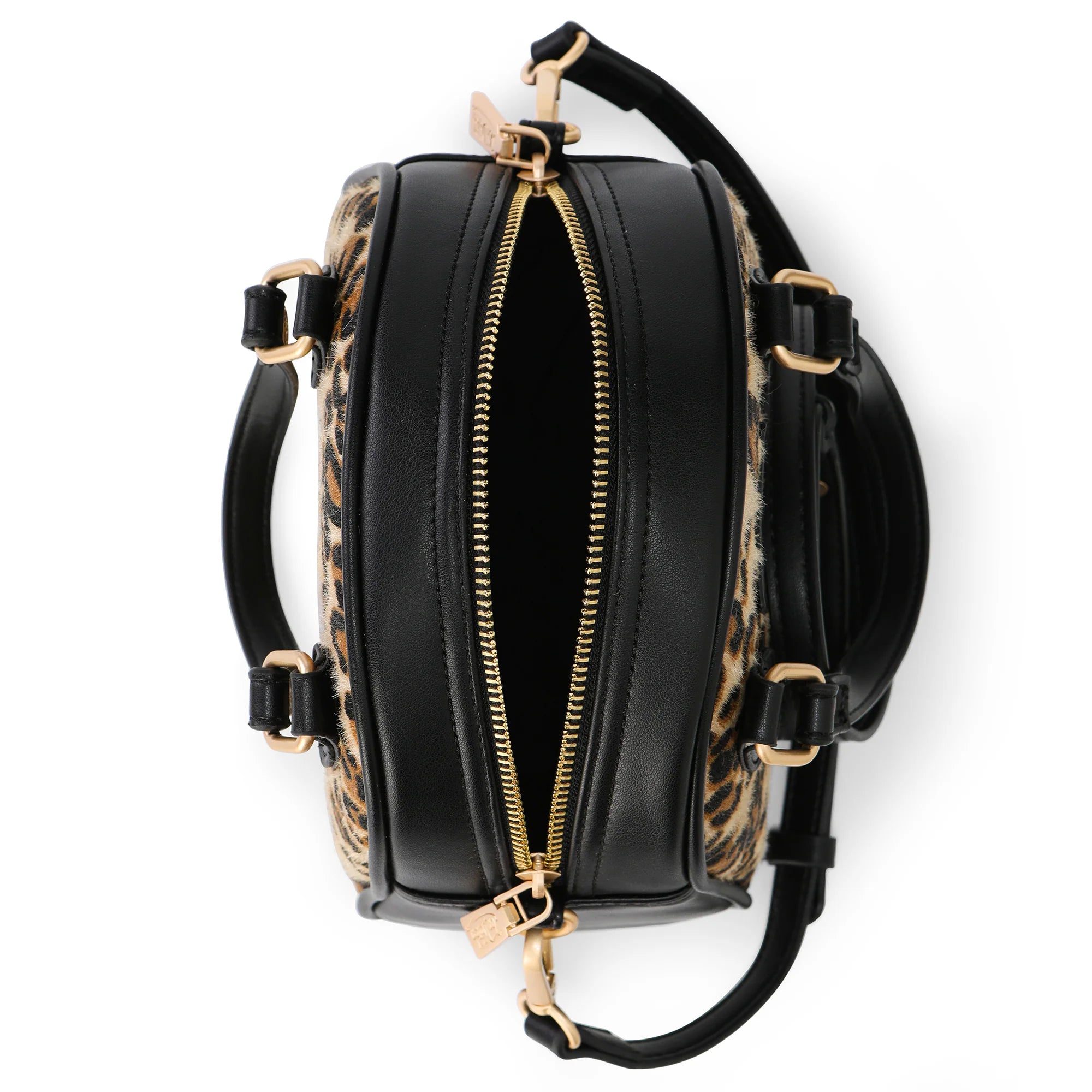 Unleash your wild side with this luxe, compact bowling bag crafted from full-grain faux pony-hair leather adorned in a bold leopard print—where fierce style meets functional elegance.