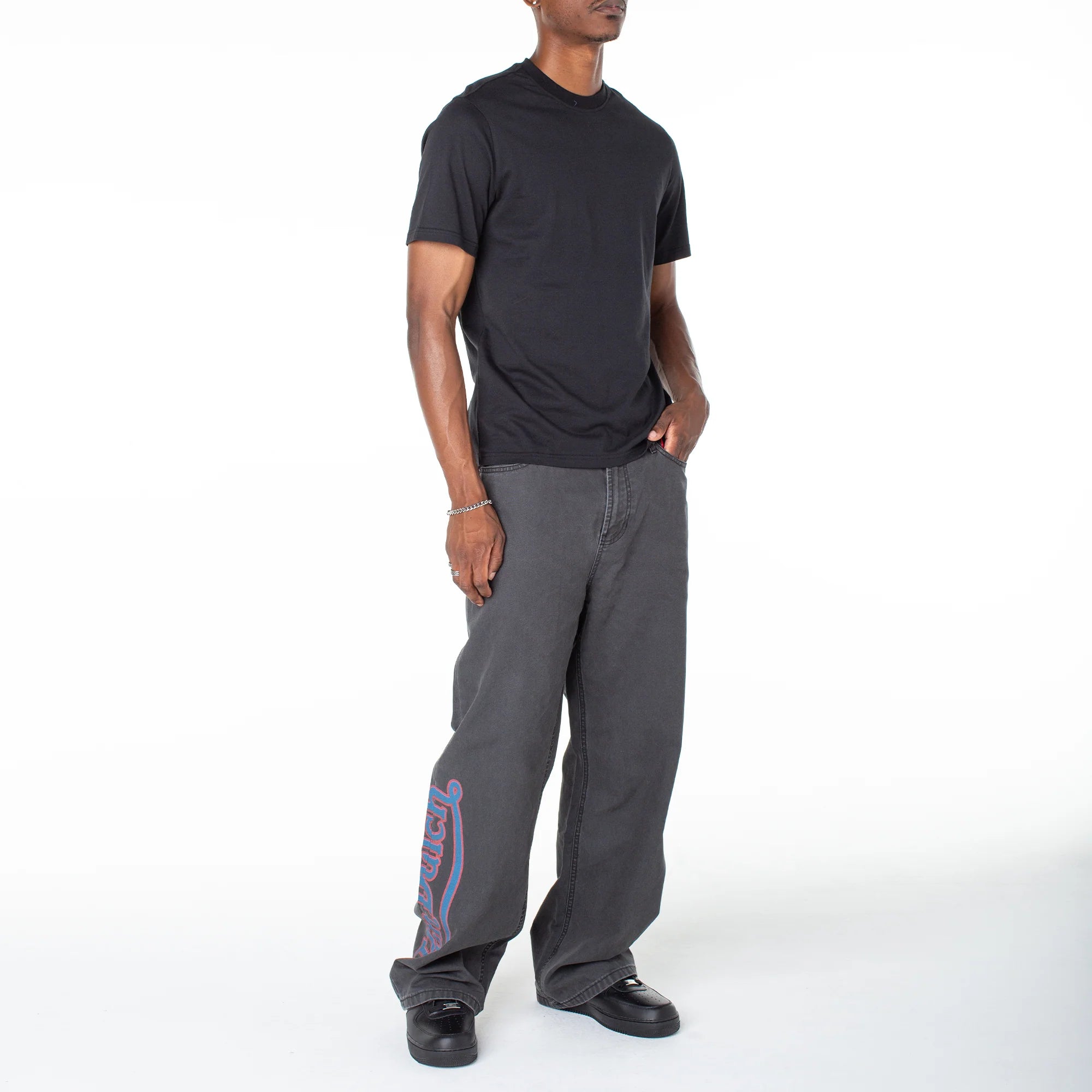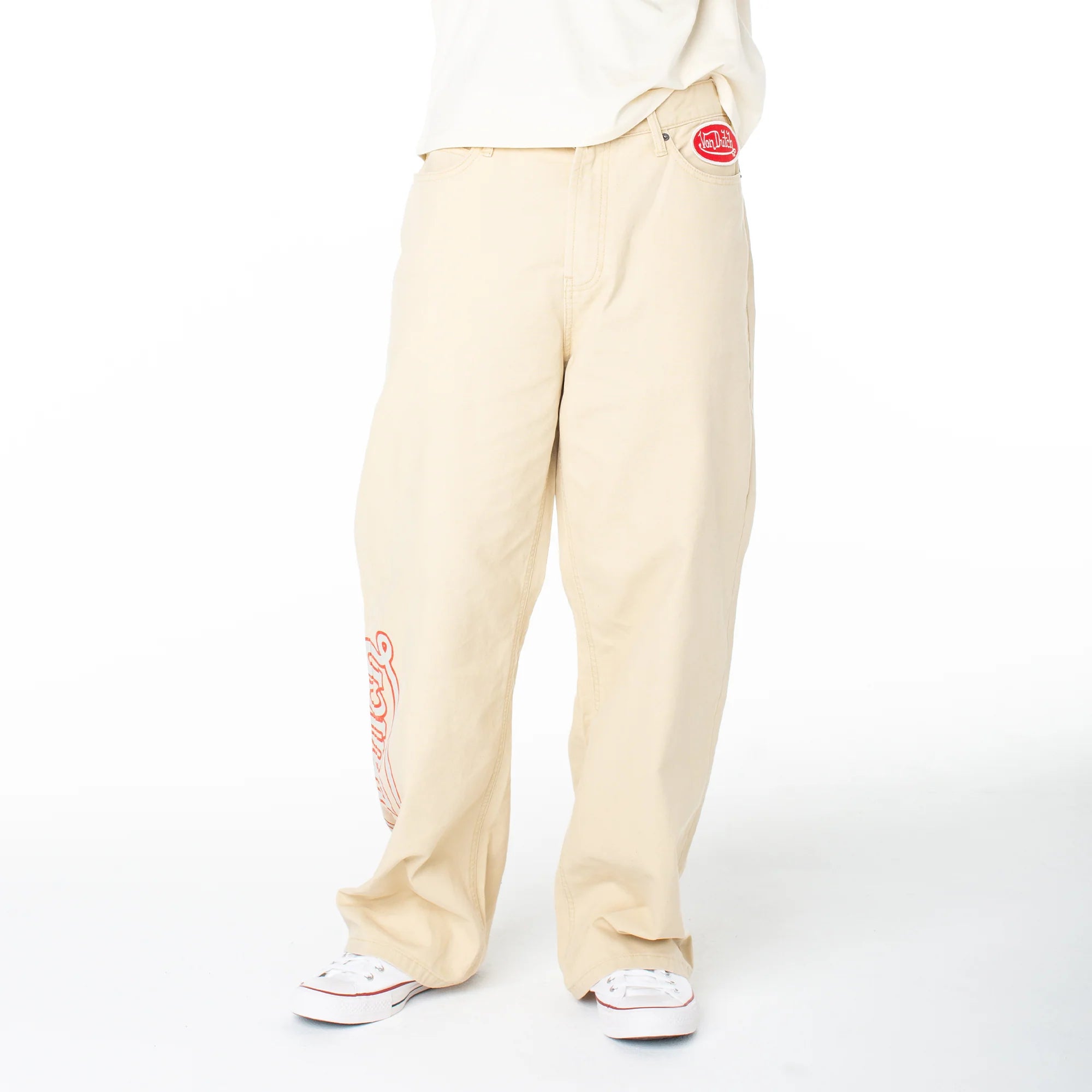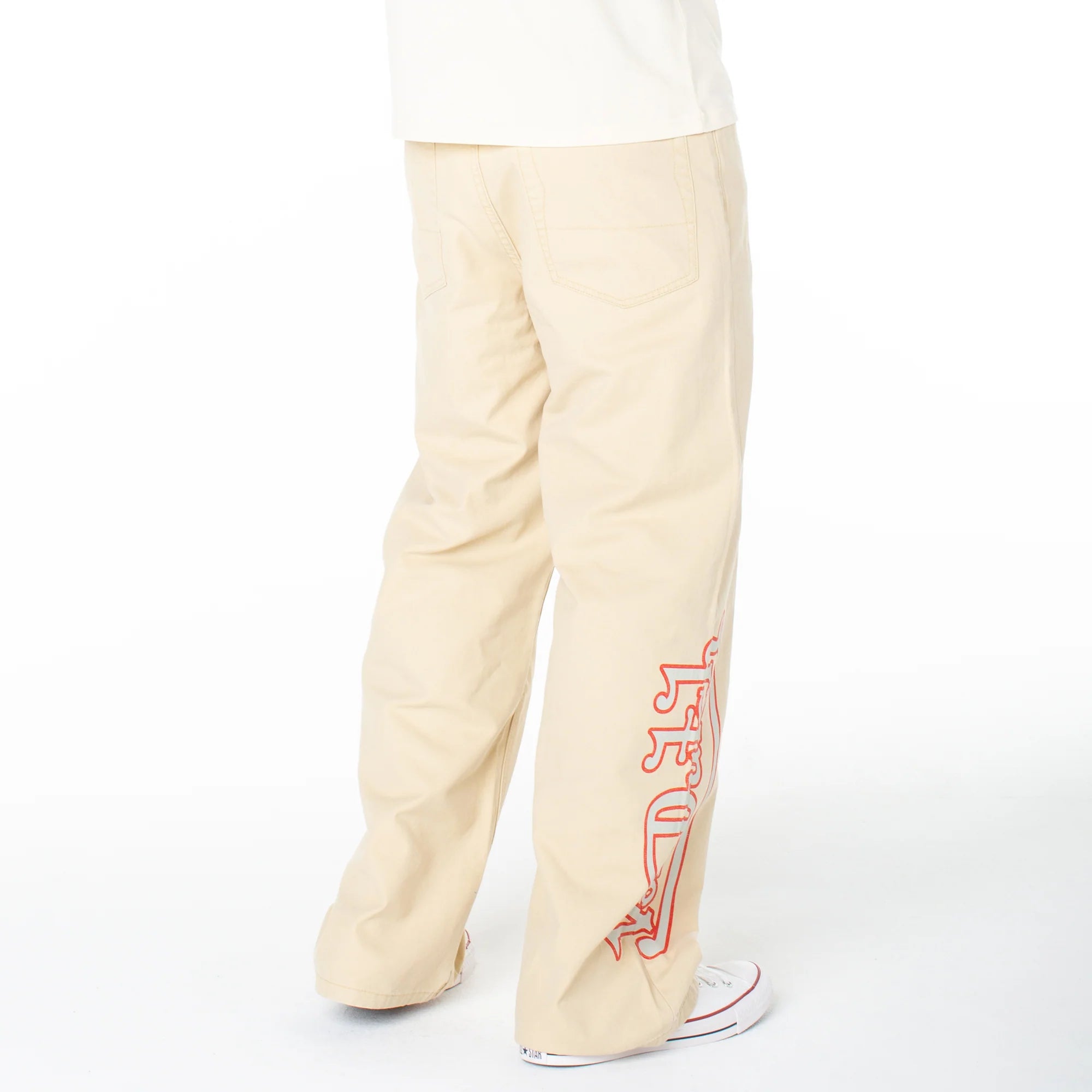 Serve streetwear casual in a baggy straight that features a bold contrasting graphic and lower-leg side patch. Match back to its coordinating snap-front short sleeve top for a one-and-done look.