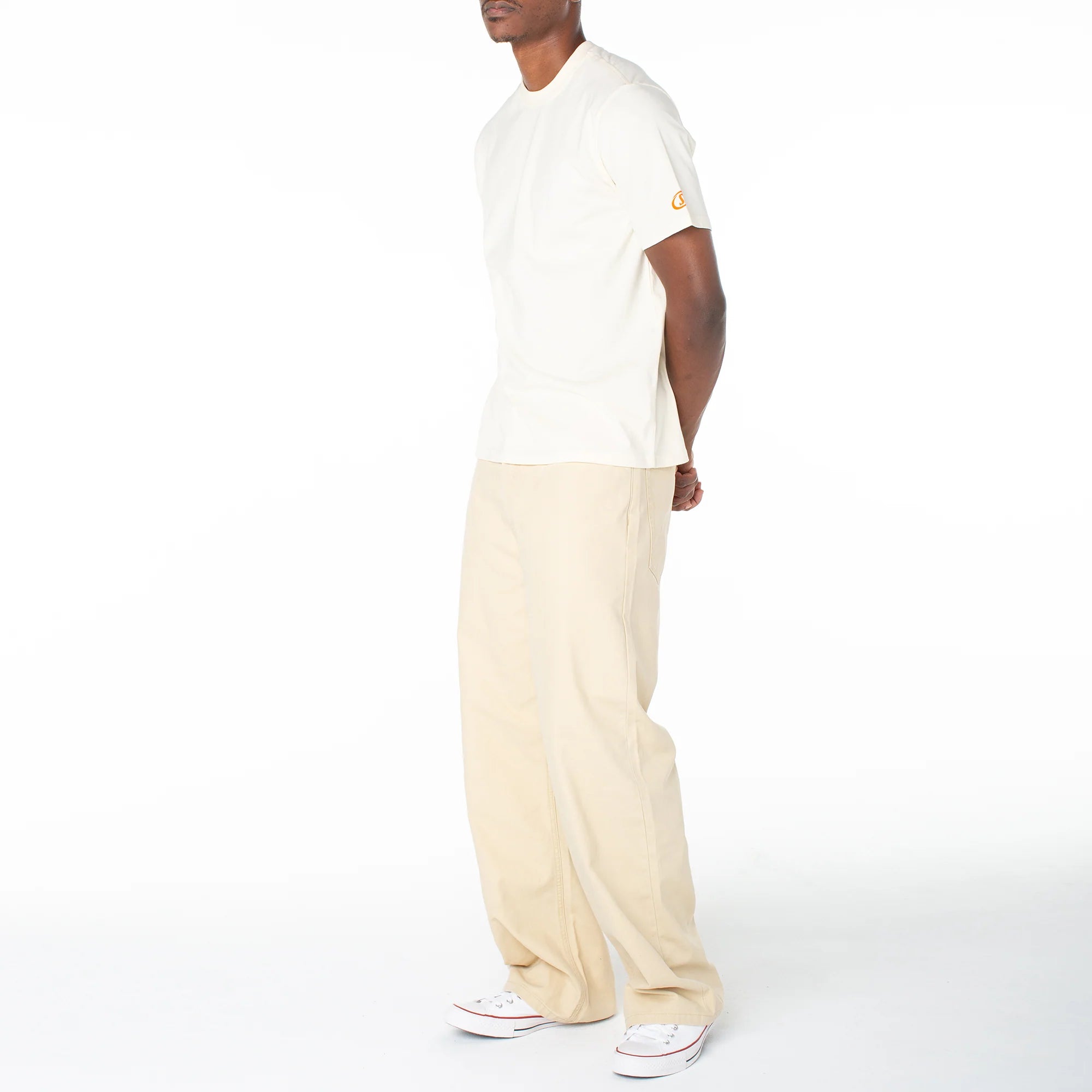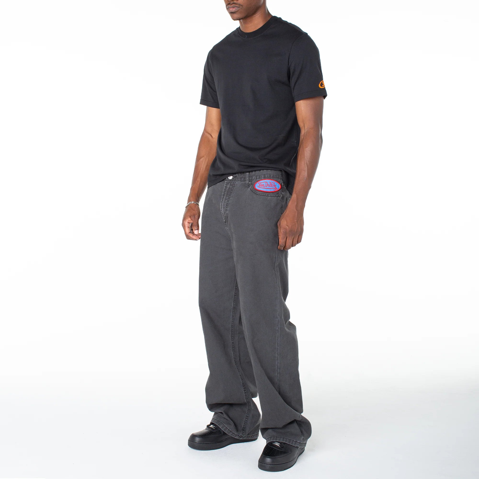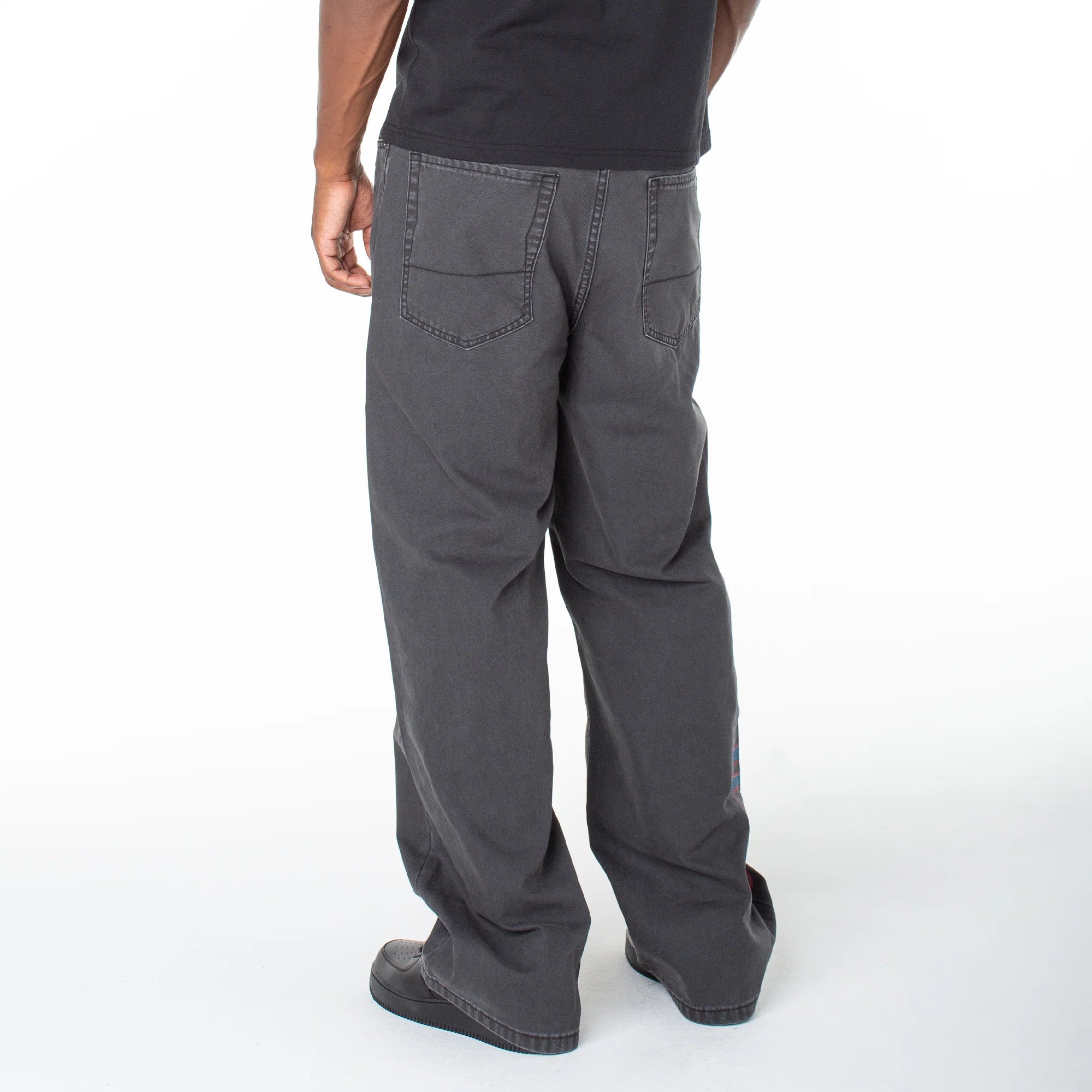 Serve streetwear casual in a baggy straight that features a bold contrasting graphic and lower-leg side patch. Match back to its coordinating snap-front short sleeve top for a one-and-done look.