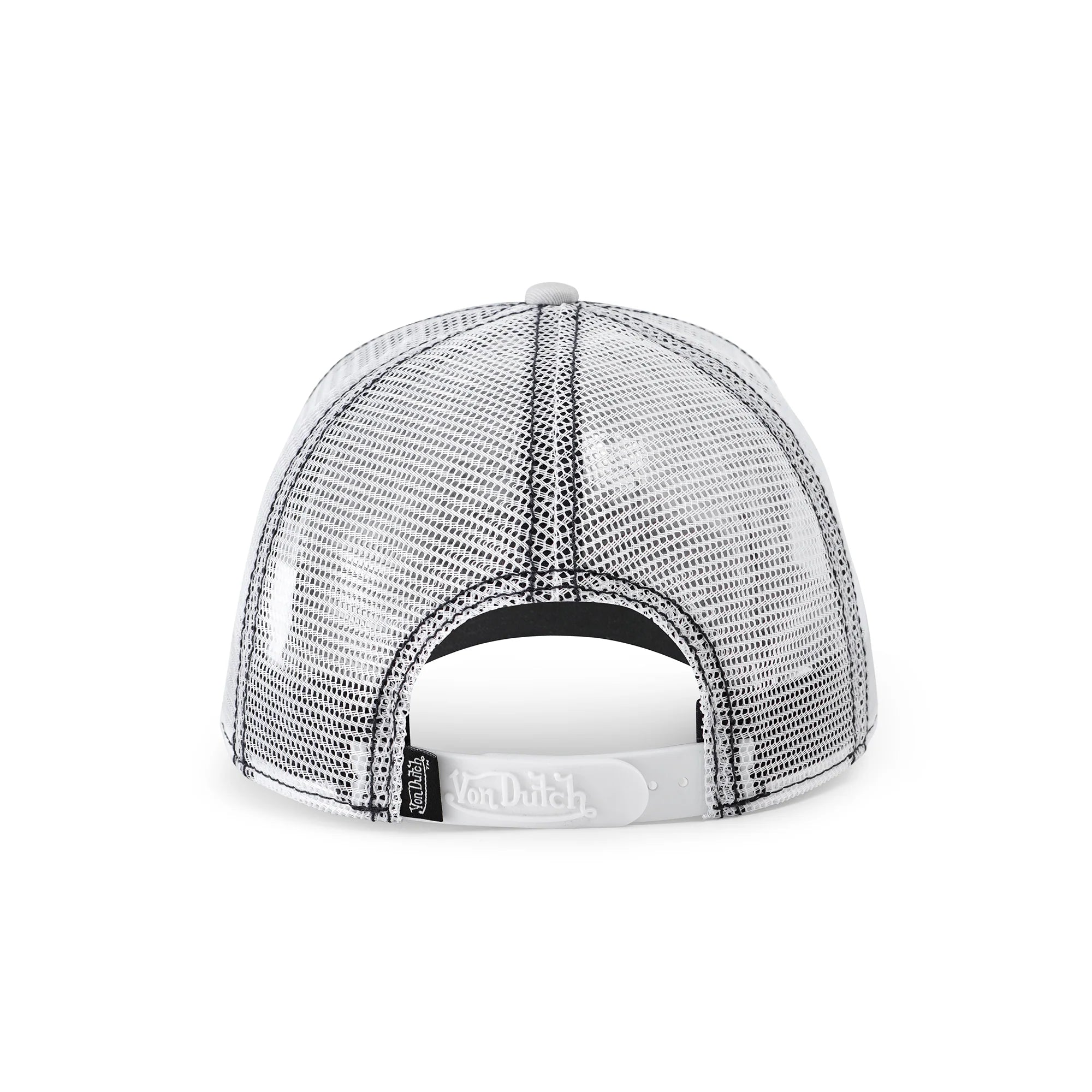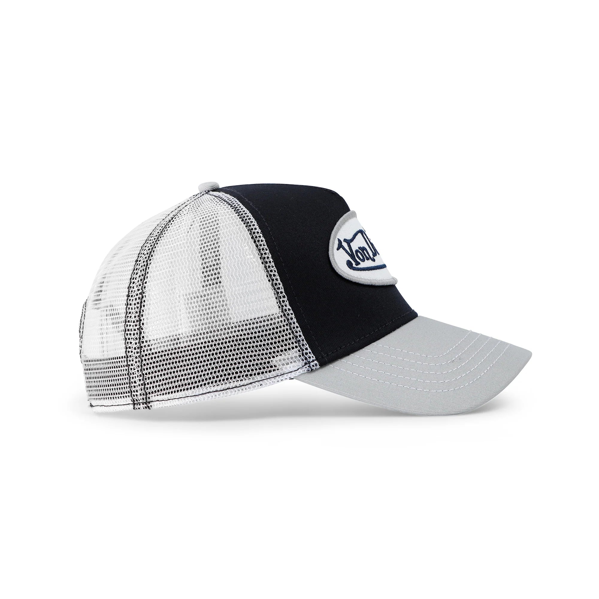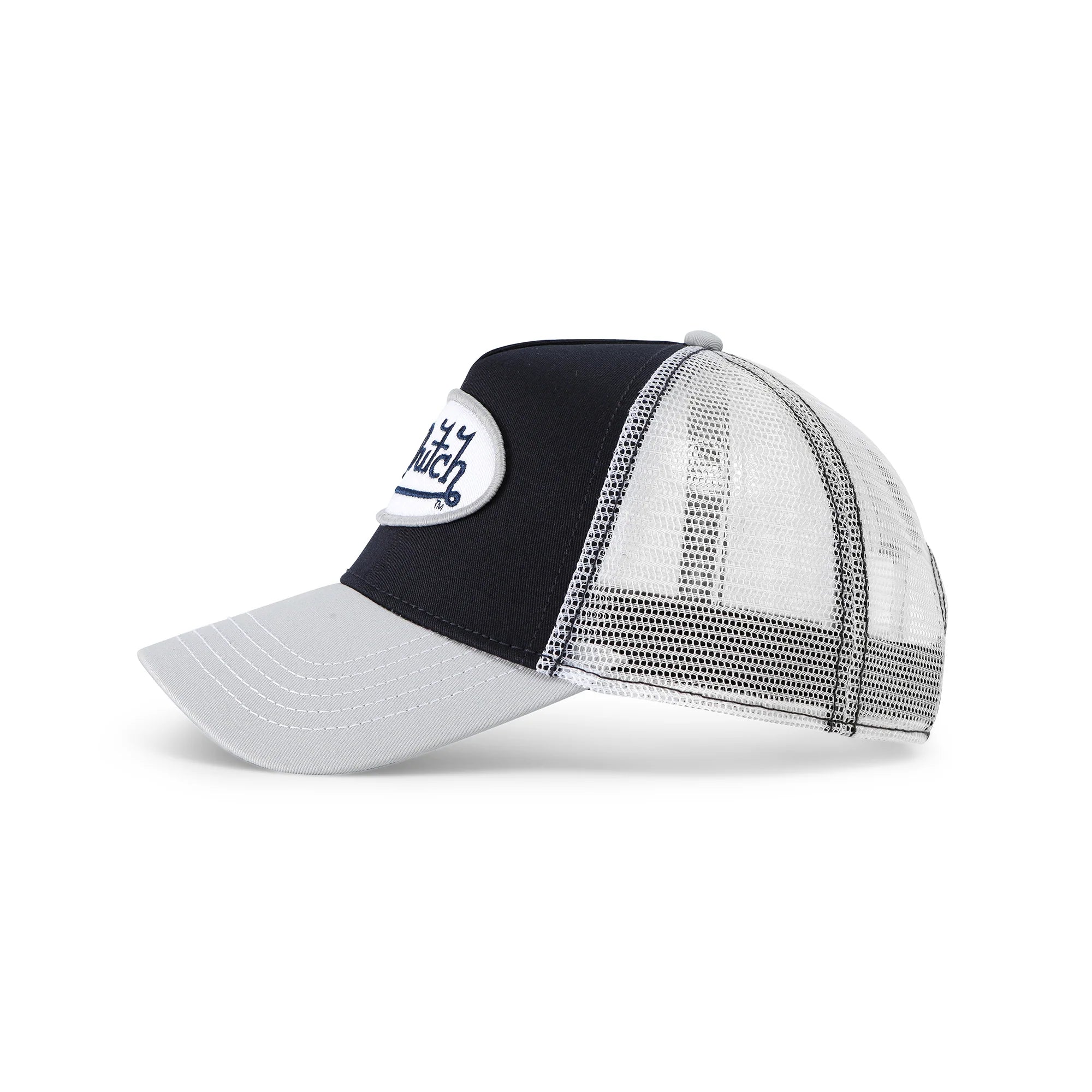 A classic snapback trucker hat by Von Dutch in navy and silver with iconic logo patch on front, White breathable mesh rear, and an adjustable snapback panel.