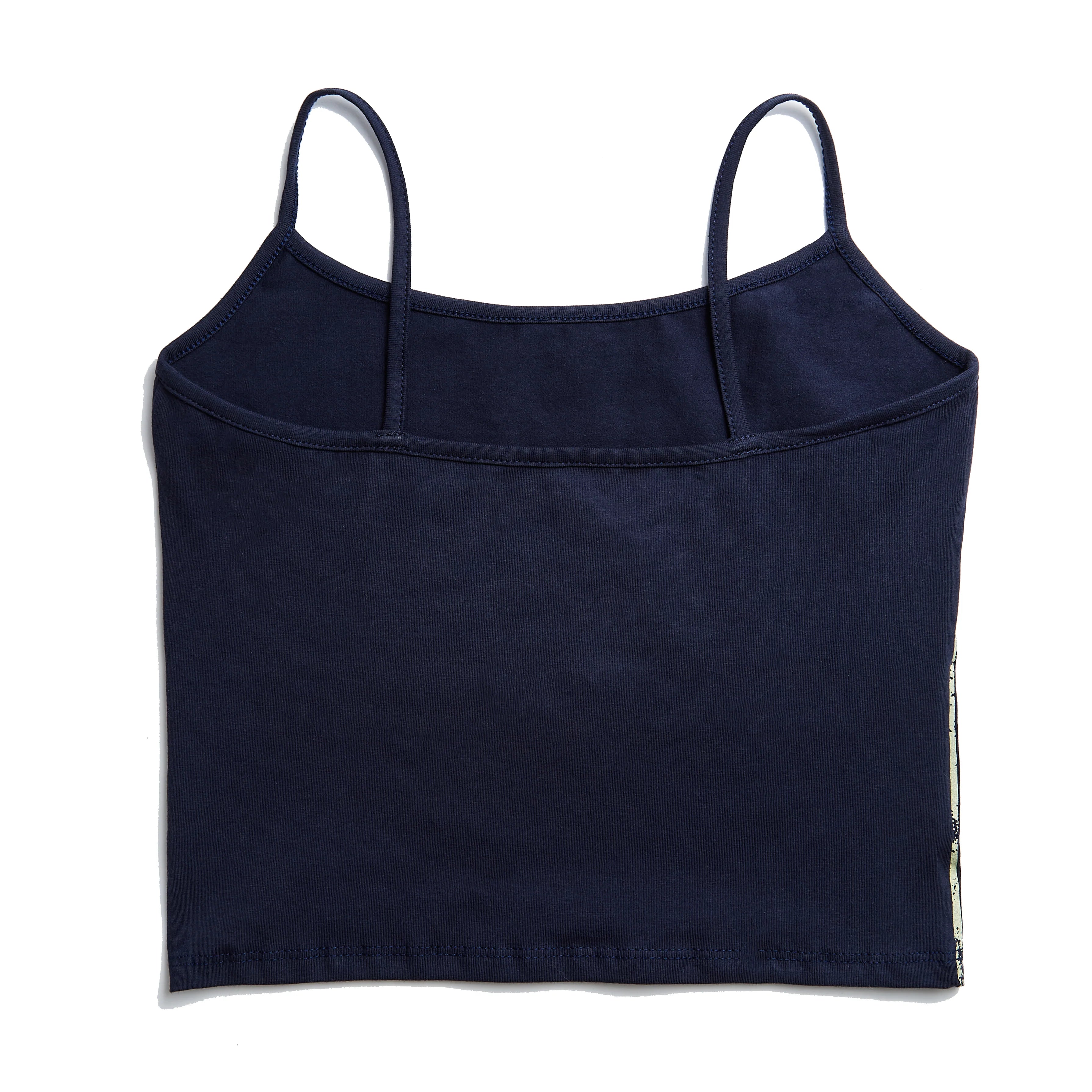Von Dutch spaghetti strap top. Made from soft stretch cotton, this Navy tank features a faded American flag print on the left side and yellow Von Dutch logo on the chest.