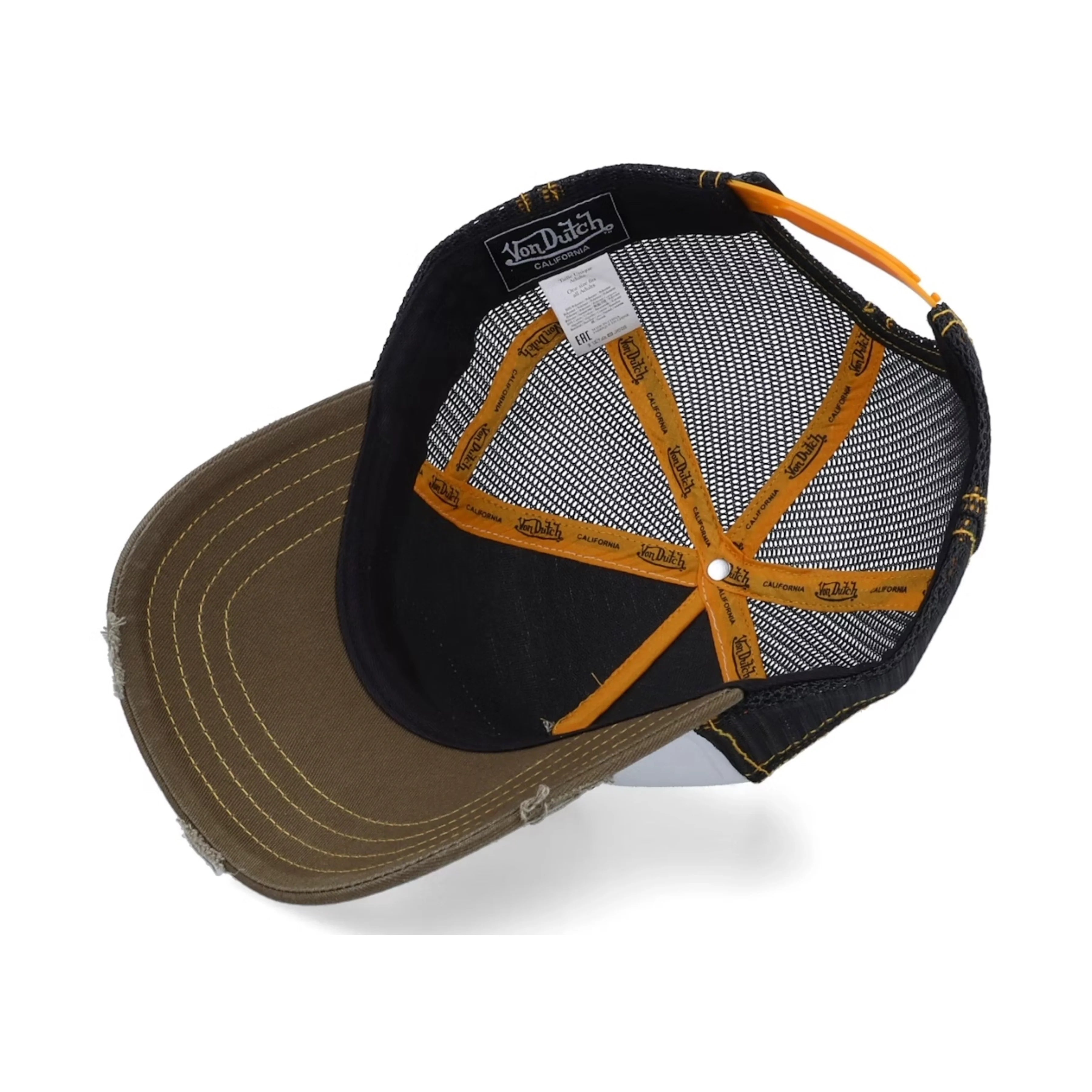 This Classic Snap back Trucker Hat by Von Dutch in White,Olive Green Brim with the classic logo in yellow. Features the iconic logo patch on front, black breathable mesh rear, and an adjustable snap back panel. All head wear sales are final.