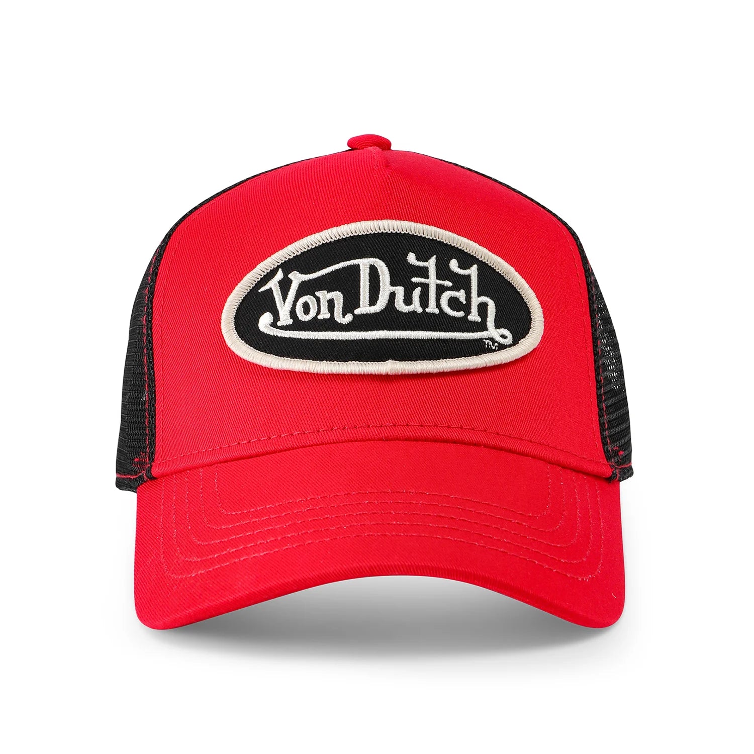 This Classic Snapback Trucker Hat by Von Dutch in red, off-white and black. Features the iconic logo patch on front, black breathable mesh rear, and an adjustable snapback panel. All headwear sales are final.